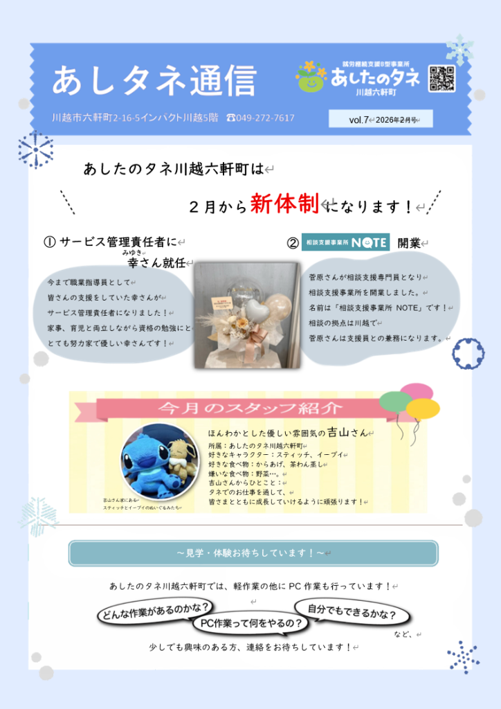 こんにちは! あしたのタネ川越六軒町スタッフです。 あしたね通信Vol.7が発行されました。 以前ブログにも書きましたが、 2月から新体制になったので、 そのことが中心になっています! 今回も利用者さんが可愛く作ってくれました! 皆さん要チェックです★